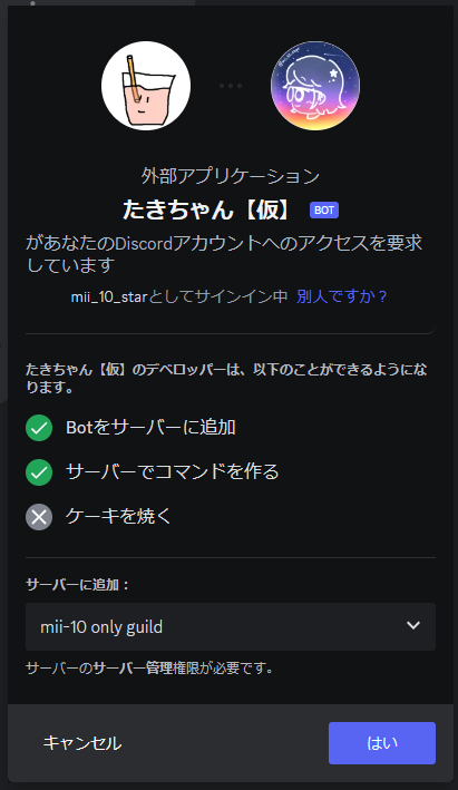 このリンクをつかうことで、あなたがサーバー管理の権限を持つサーバーに追加することができます。